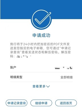 支持将五年内的活期账户明细发送至电子邮箱(一般24小时内发送)。申请成功页面显示提取码,登录邮箱使用提取码(即解压密码)打开邮件附件查看。